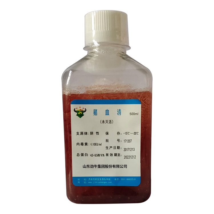 豬血清:系采用健康豬血液為原料,經采集、分離、多級微孔濾膜過濾除菌和適宜劑量60Co照射。本產品無支原體、病毒和細菌, 內毒素小于10EU/ml。適用于豬肺炎支原體等多種微生物的培養(yǎng)。